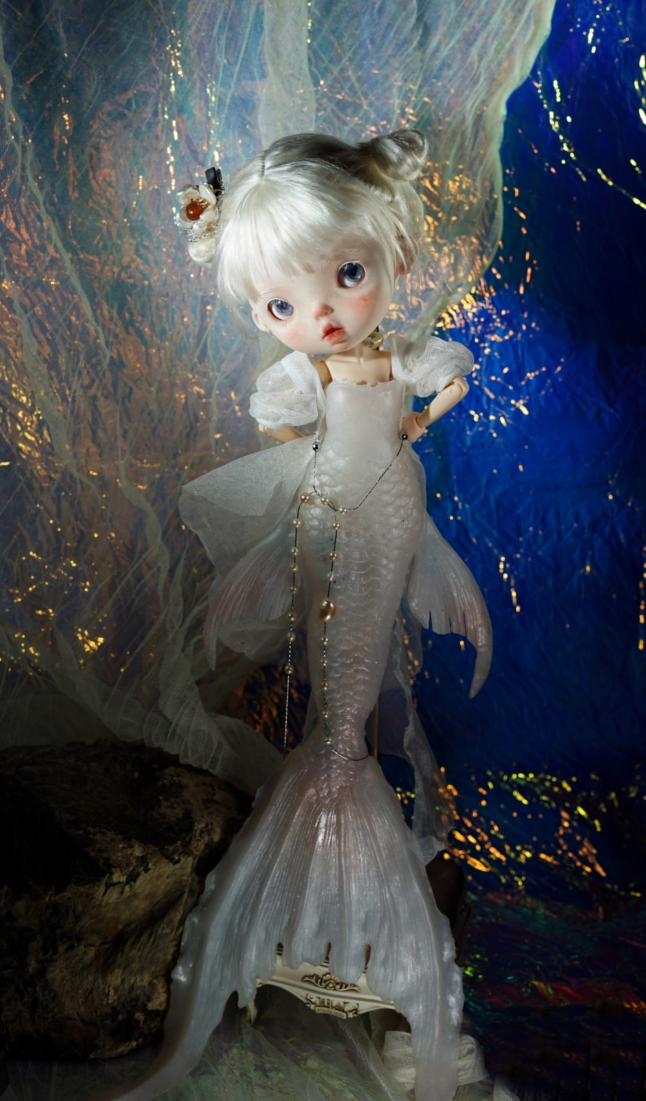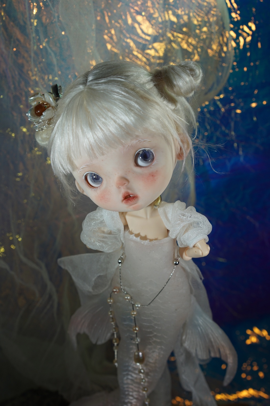 Adoption Nini include: mermaid tail, eyelids, eyes holder, metal neck, ob22 body, wig, dress,