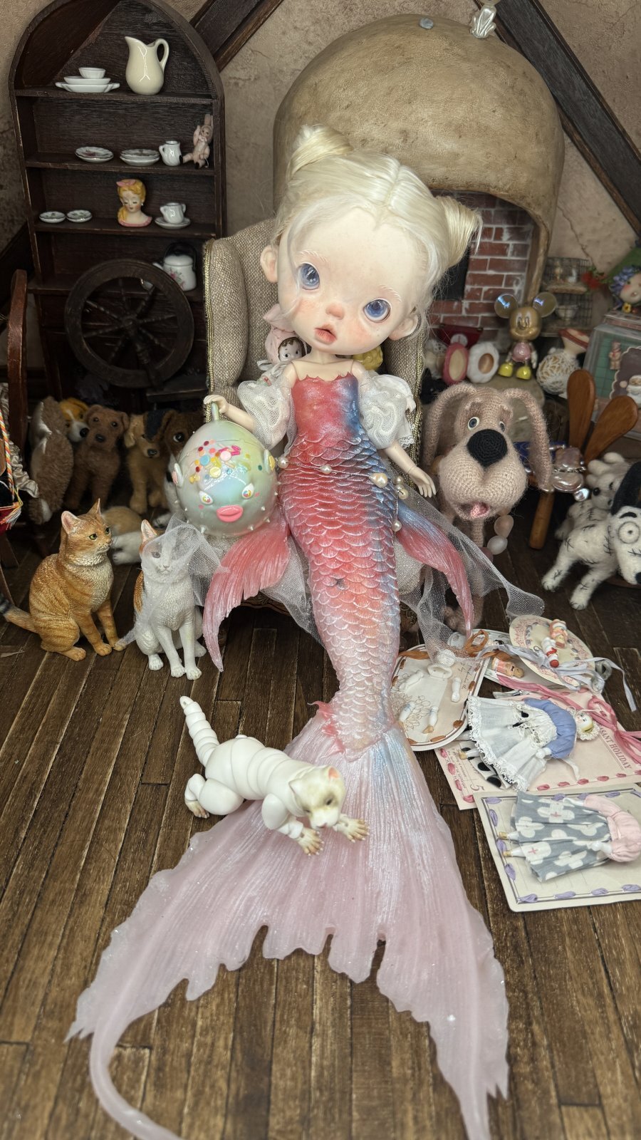 Adoption Nini include: mermaid tail, eyelids, eyes holder, metal neck, ob22 body, wig, dress,